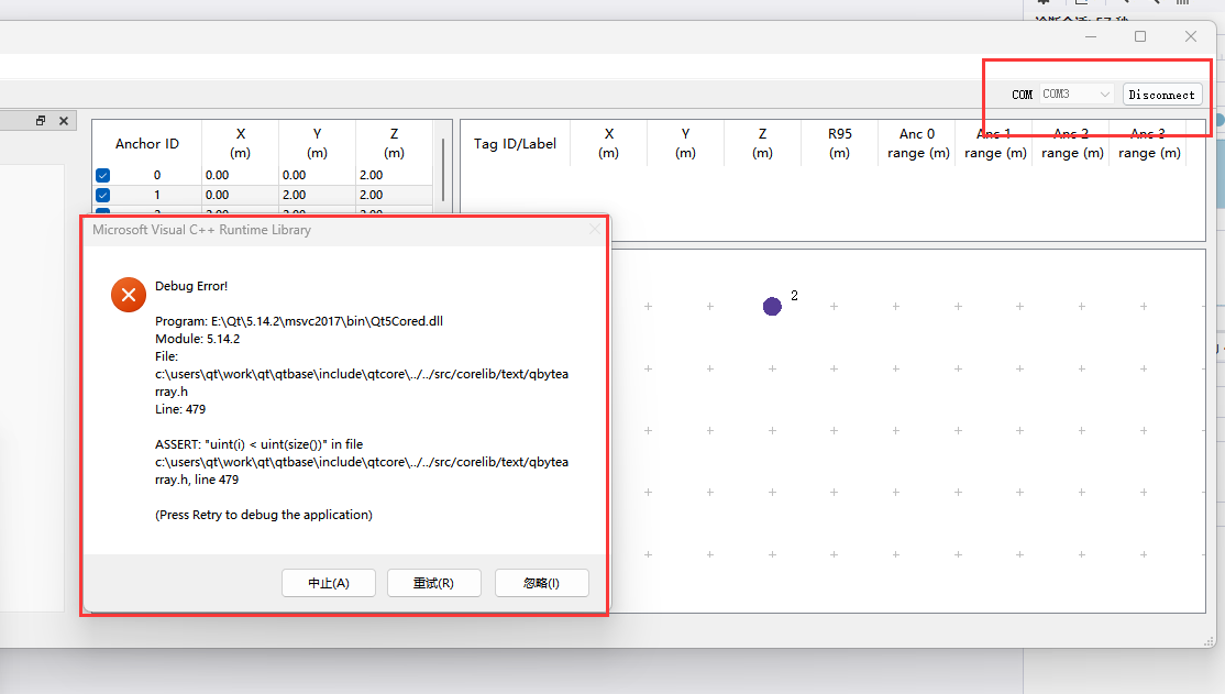 在vs2022安装的qt5插件下,运行定位上位机 选择串口点击connect 弹窗debug error 求解