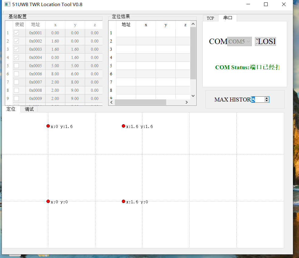 首先看下你串口原始数据,确保格式正确 然后关闭串口软件,这个上位机连接COM后点击 “调试”看下原始数据, 这个版本的上位机必须用4个基站,而且是开源版本固件代码。 |