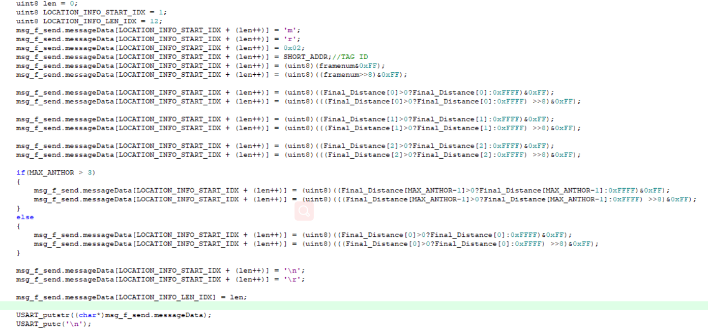 定义了串口发送函数,然后把它用在了msg_f_send.messageData[0]='M'; 里面发送给基站0之前,把数据打印出来。 调试串口显示是 6D 72 02 05 94 0A 4D ,循环 ,94 0A 4D ...