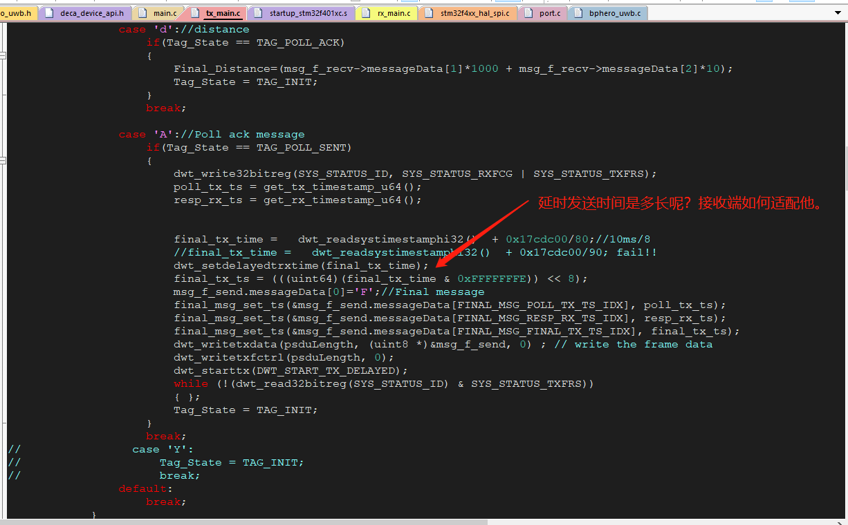 这个帖子描述的比较好,图文并茂。赞一个! 关于final_time,这个在你贴的第一个图中,有给final_time 赋值,可以再看下。 还有,你在调试过程中,UWB TWR测距过程中加了很多打印信息,这会导致整个流程的失败,因为由于本模块串口打印,导致对方UWB等待时间超时,整个流程就Fail掉了。 可以将时间戳统一记录,在完整的TWR流程完毕后,将所有时间戳信息打印出来 |